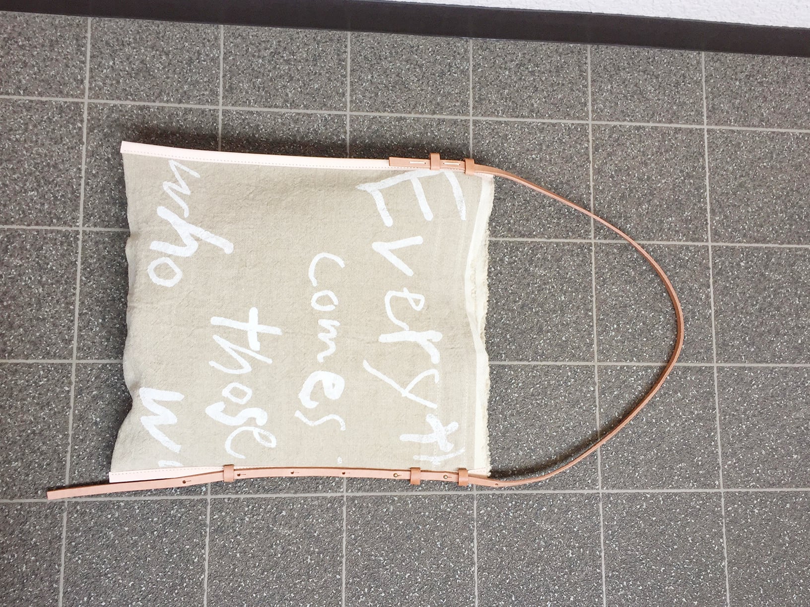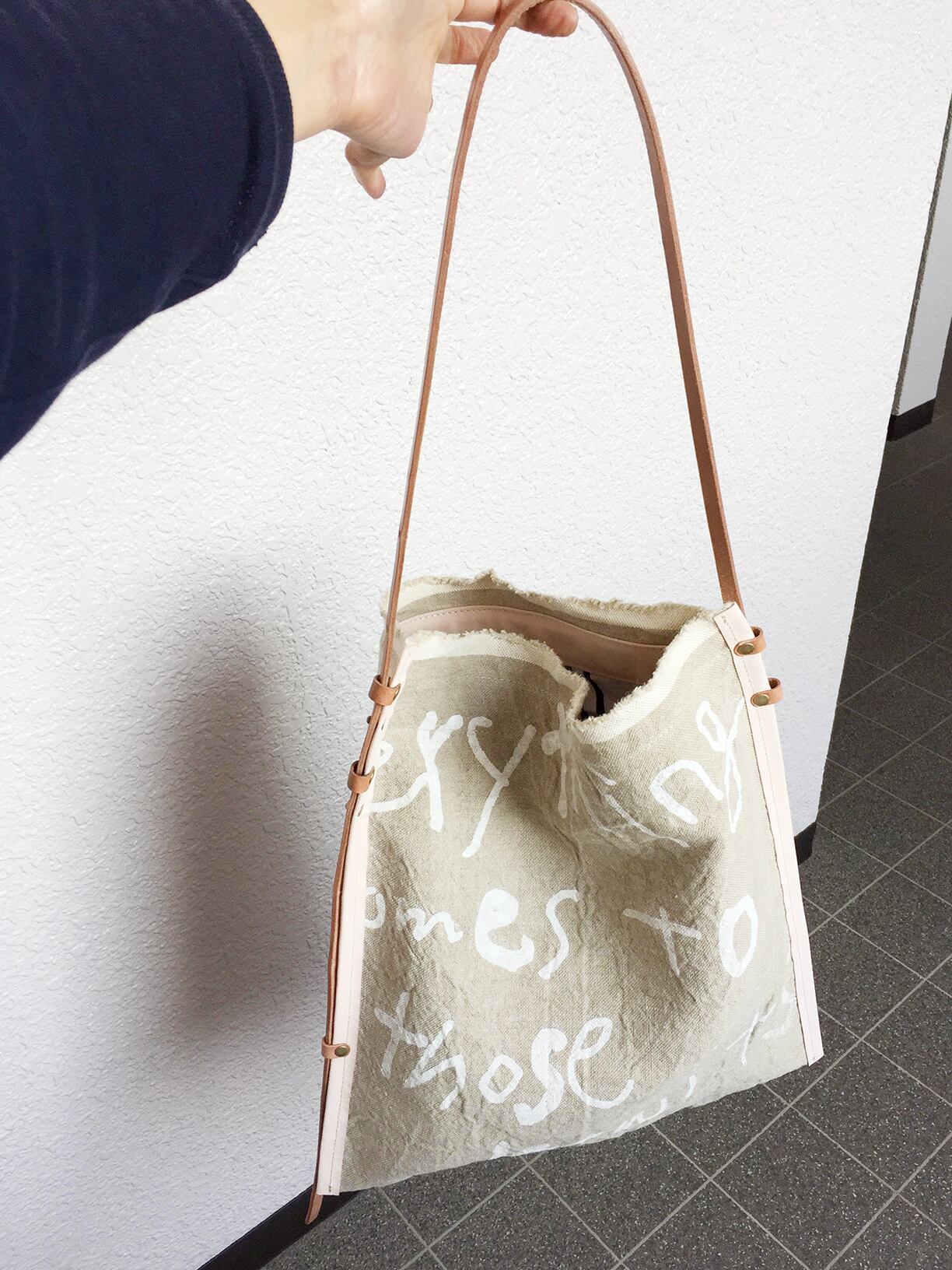 洗いをかけたヨーロッパリネンのキャンバス地にタイポグラフィーをハンドプリント。 牛革のストラップは調整可能です(斜めがけ、短めショルダー)